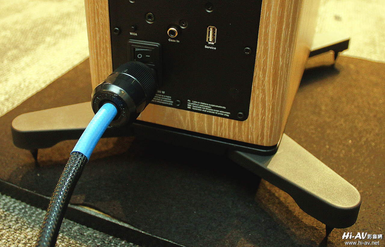 Focus 50背板的黑色金屬板裡面就是輸出入電路、DSP電路板與110瓦+280瓦+280瓦後級的放大電路,由於背面這塊金屬板也要作為散熱之用,整體面積幾乎是前代Focus 600 XD的三倍大。上面這張照片顯示的是「Focus 50副喇叭」背板,除了電源線插孔、電源開關之外,就只有一個WiSA無線連接按鍵、同軸數位輸入與維修USB插孔,其中同軸數位輸入是用來與「Focus 50主喇叭」有線數位連結之用。