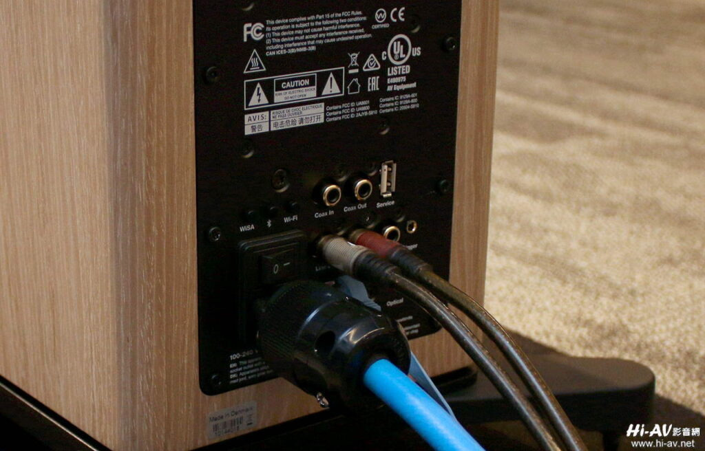 Focus 50主喇叭背板標示了許多安規認證標誌,左下角還有「丹麥製造」(Made in Denmark)字樣。主喇叭背後的端子就比副喇叭多了不少,有藍牙與Wi-Fi連接的按鍵,也有同軸數位輸入與輸出(後者作為與副喇叭數位連接使用)、光纖數位輸入、乙太網路輸入、類比立體聲輸入與超低音信號輸出等。