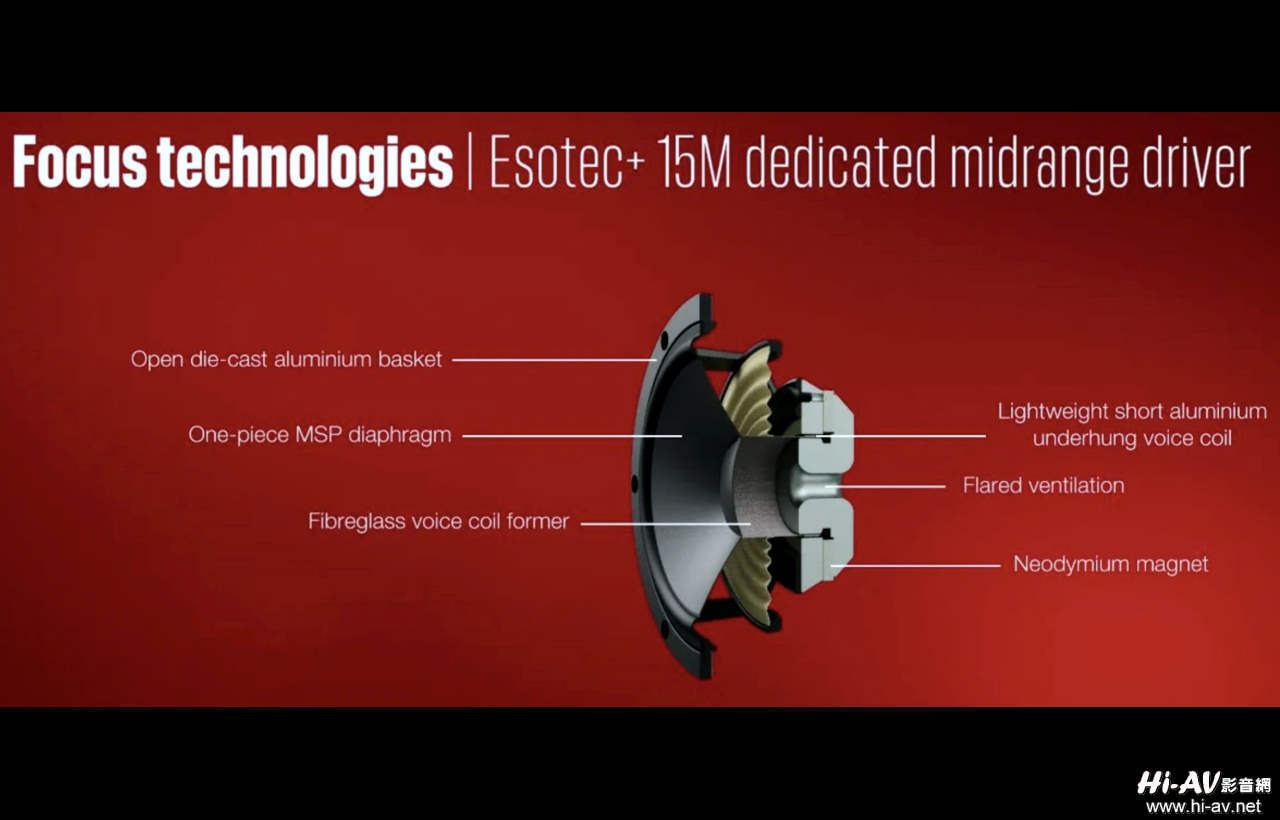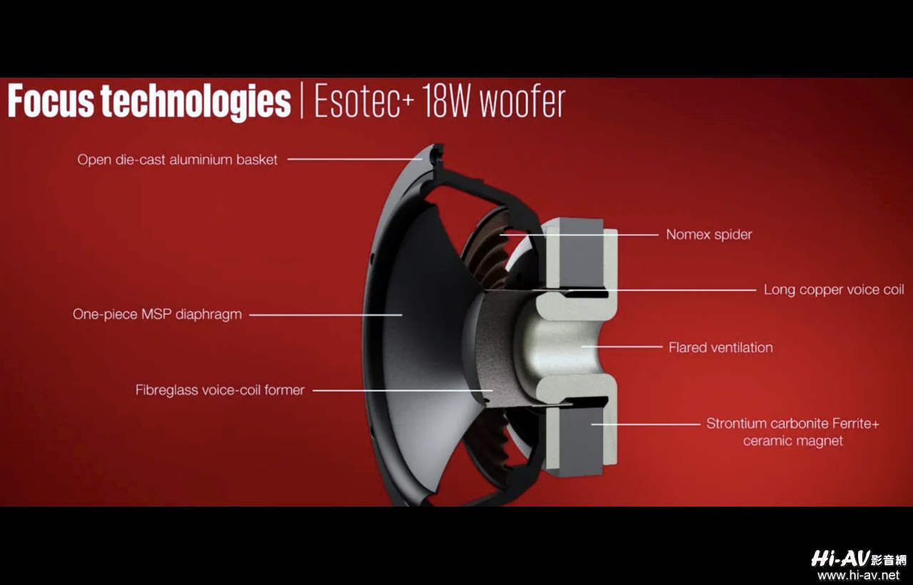Focus 50所使用的這支18 cm Esotec+低音單體同樣也配備一體成形的MSP振膜,音圈筒採用玻璃纖維材質,音圈部分採用銅線繞製以承受更大的電流量,與中音單體一樣在單體背面有開孔,來讓音圈套筒防塵蓋背面壓縮的空氣能快速宣洩,使得MSP振膜的動作更敏捷。