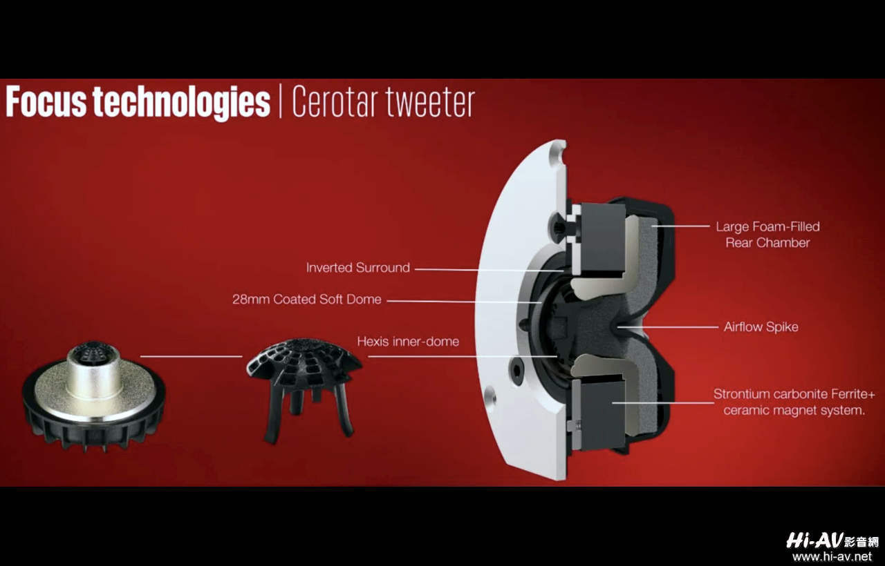 Focus系列三款喇叭都搭載相同的28 mm直徑Cerotar高音單體一支,Focus 50落地式喇叭以14 cm MSP振膜單體一支作為中音(Focus 10 與Focus 30以其作為中低音單體,每聲道各配置1支與2支),從前障板都看不到任何鎖固螺絲,單體外框與前障板的貼合度也無懈可擊。