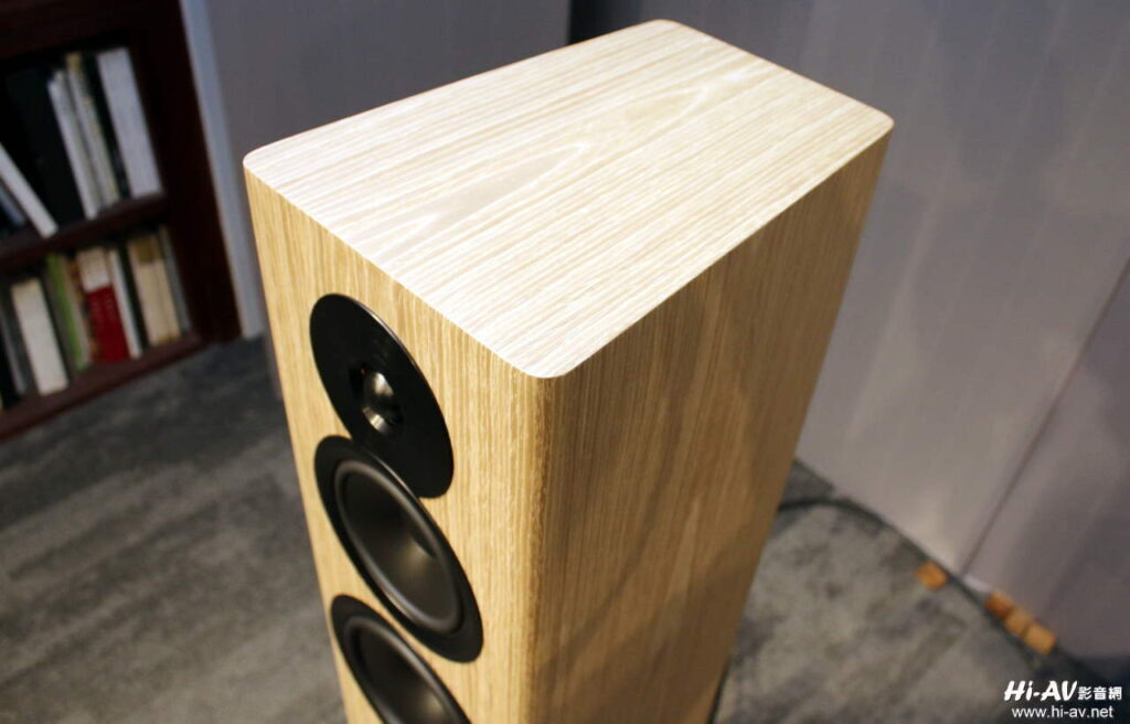 Focus系列的音箱並非方方正正,而是前障板較寬、背板較窄、左右側板不平行的設計,前後左右四個角也處理成弧形圓角,原木木皮提供胡桃木、亞麻金、黑色與白色等四種不同版本外觀。