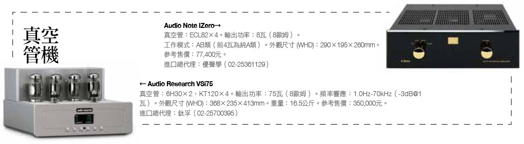 第二,輸出功率我想選擇一大一小。比起規格動不動就破百瓦的晶體機,真空管機求好不求量的有限功率一直讓人有所顧慮。但既然本次的音樂鎖定在「輕柔女聲」,同時又是在輕鬆無壓的狀態下聆聽,我想測試看看除了個性搭配之外,擴大機的輸出功率大小究竟會對聽覺造成多少差異性。參考到以上兩個挑選標準,最終我選擇每聲道備有75瓦的Audio Research VSi75,與每聲道僅有8瓦的Audio Note IZero。
