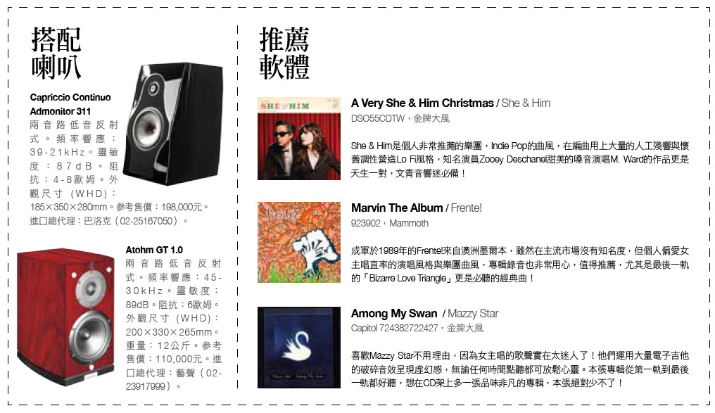 先說管機,ARC VSi75與Audio Note IZero各有優勢,VSi75由於瓦數大,低頻控制與動態較好,對呈現電子迷霧重重的Dream Pop有很好的效果,缺點是管味較不明顯,也需要更多時間暖機;而IZero的音質、音色都散發金黃色的管味,其中頻凝聚又精緻,呈現的女聲甜美有魅力,較可惜的地方在於小瓦數,得搭配靈敏度高的喇叭才能發揮。再來談到書架式喇叭Capriccio Continuo Admonitor 311與Atohm GT 1.0,兩方都各有本領;311的解析力好,中高頻表現突出,中低頻的部分須搭配瓦數大的VSi75較能伸展;而GT 1.0頗有鑑聽個性,靈敏度也較高,能充分反映前端器材的個性,搭配IZero最能聽到真空管的醇美質感。