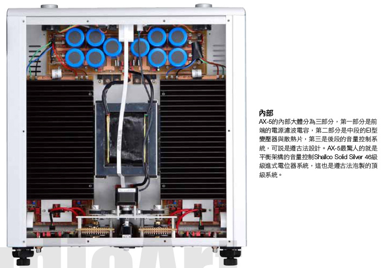 打開頂蓋,可以清楚看到中央一個EI型電源變壓器,左右二側各有一片散熱片,散熱片底下就是功率晶體。而在散熱片前方則是濾波電容與電源供應相關線路。散熱片後方則是一個大大的機械式音量控制系統,包括一個驅動的馬達,連動的皮帶系統,還有左右獨立的Shallco Solid Silver 46級級進式電位器。電位器左右二邊則是連接輸入端子的前級線路,AX-5的前級線路移植自旗艦前級的Variable Gain Technology(VGT,也就是音量控制系統)。 仔細看那電位器,會發現它們是二層的,也就是每聲道有二層46段電位器。為什麼每聲道有二層?這是標準平衡式電位器,每聲道的正訊號與負訊號各一層。