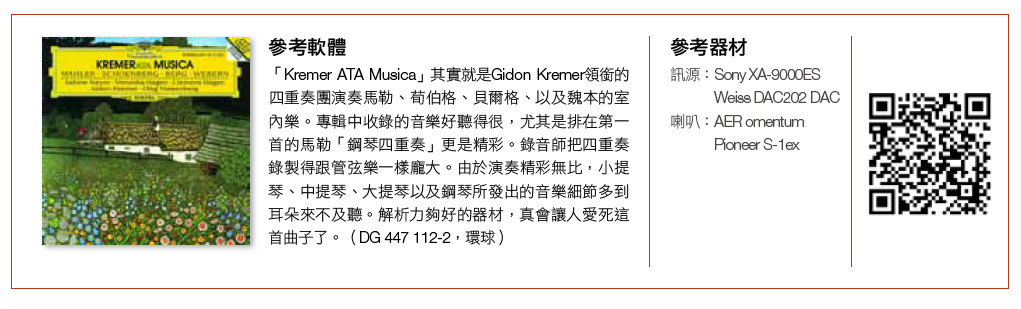 AX-5的解析力如何?我用馬勒的鋼琴四重奏來說明。這是收錄在「KremerATA Musica」第一首的音樂,其實就是Gidon Kremer領銜的四重奏團演奏馬勒、荀伯格、貝爾格、以及魏本的室內樂。可不要小看鋼琴四重奏,聽起來聲音細節超豐富,簡直如潮水般源源不絕湧來,如果沒有很好的解析能力,您聽到的就會是雜亂不堪的聲音。到底AX-5讓我聽到什麼樣的聲音呢?音樂規模感龐大,音場內的解析清晰, 好像牛角梳子梳理過的女人長髮,頭髮多而柔軟,還可看出絲縷,不會如塑膠梳子梳過那般因為產生靜電而雜亂。