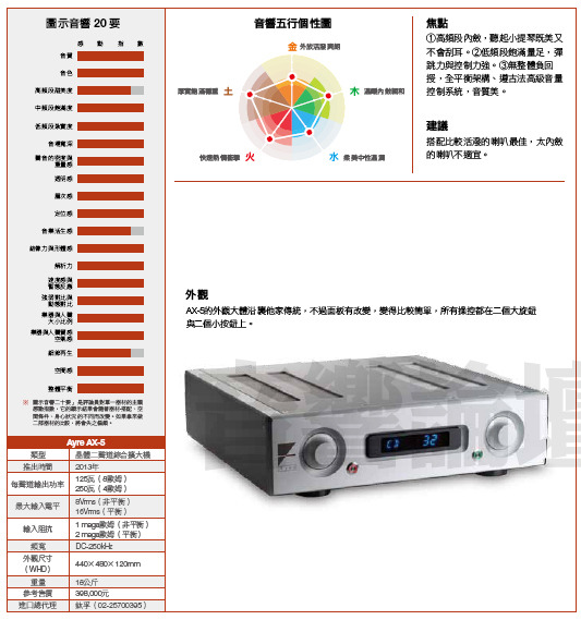 Ayre AX-5並不是一部高價分離式擴大機,而是一部許多人負擔得起、能讓更多人享受好聲的綜合擴大機。過度期待它能夠跟高價擴大機並駕齊驅,那是脫離事實;但如果您輕視它,那更是走寶。如果您以前夢想擁有Ayre的前、後級而不可得,現在您可以實現夢想了。Charles Hansen已經替您整合,把所有的看家本領集於AX-5一身,讓您獲得一部可以把音樂唱得既「對」又「美」的好機器。