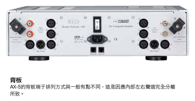 與AX-7e相比,AX-5的面板更顯簡潔,左右二個大旋鈕,大旋鈕底下有二個小圓按鈕,中央是顯示幕。背板上則以相當罕見的樣子排列著5組XLR端子,以及2組RCA端子,還有一組喇叭線接端斜斜安置。那2組RCA端子標示5與6,而5組XLR端子中,一組標示Tape Output,其餘標示1-4。所謂Tape Out就是錄音輸出,也是訊號輸出給耳機放大器之處。其他1-6則是六組輸入端子。除此之外,在電源線插孔下方還有二個方形AyreLink,這是用來與其他Ayre產品連動、傳輸各項資訊分享用的,許多擴大機都有此裝置, 但使用的人並不多。