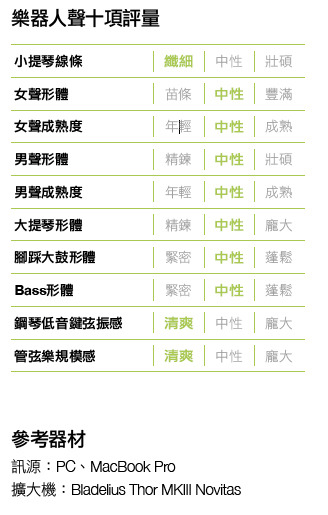 當我聽完Codex同時擔任耳擴與USB DAC時的好表現後,第二階段的測試就移師論壇大試聽室,這時候就把Codex的功能更單純化,只作為USB DAC,接上的系統是BladeliusThor MKⅢ Novitas綜合擴大機與Marten Django XL,音樂訊號來源是MacBook Pro。在少了功率輸出這項變異因素與參考系統從耳機換成喇叭後,音像呈現勢必更龐大,音場空間也比較開闊深邃,但是整體頻段的協調性與聲音特質與搭配耳機聽到都很相近,就算是用喇叭系統聽,低頻還是偏向內斂走向。