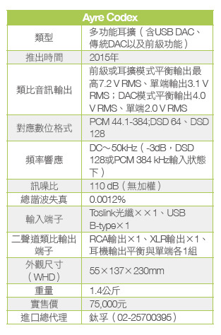 談聲音前先簡單介紹Codex。這無疑是Ayre今年最充滿話題性的產品,它不但是品牌旗下目前最便宜、體積也最迷你的產品,更是第一款耳擴,而且還是具備傳統DAC、USB DAC與前級電路的多功能機種。這樣的產品定位與定價策略難道不怕打到自家QB-9(現在是DSD版)的市場嗎?這兩款產品的訴求截然不同,QB-9的定位比較高階,只有單一的USB DAC功能。 Codex則展現了更大的使用彈性,定價策略也顯然是針對想要初步升級微音響系統或耳機系統的玩家。