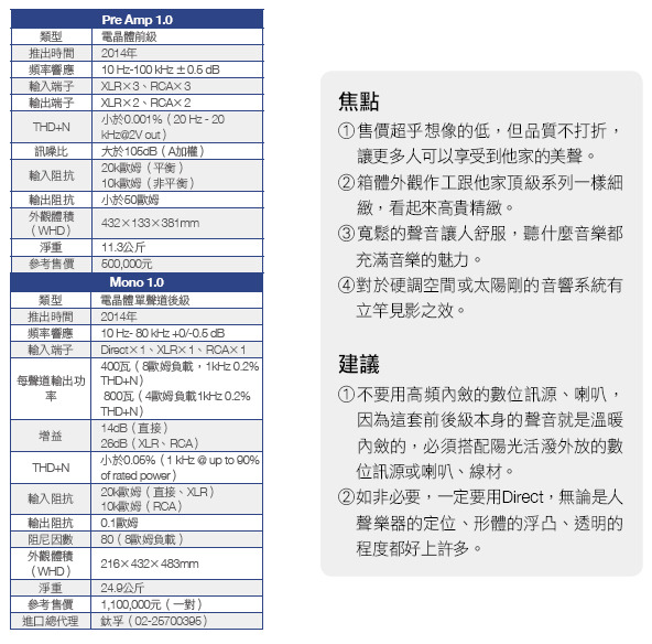 首先我要說,這套前後級是很優秀的擴大機,它的優秀不僅在於聲音特質,更在於百搭個性,在此我所說的百搭也不僅限於喇叭,包括空間亦然。如果您用的是解析力高,衝擊性強,比較活潑陽光外放的喇叭,搭配Pre Amp 1.0、Mono 1.0之後,保證張牙舞爪的個性馬上收斂,讓您聽了覺得心頭舒坦。如果您的空間屬於硬調空間,高頻量感反射太強,低頻會轟轟然,搭配上這套前後級之後,原本噪耳的感覺馬上大減,讓您可以靜下來聽音樂。 或許您要問,既然搭配陽光外放的喇叭與硬調空間很棒,那麼搭配內斂的喇叭跟軟調空間呢?