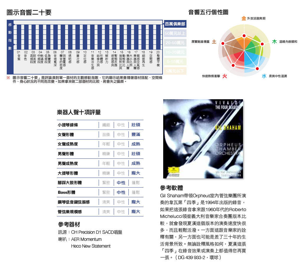 聽夏漢領銜演奏的韋瓦第「四季」更是甜潤有加,好像咬一口新鮮的韓國水梨,果肉適度爽脆,水分足得會噴出來,甜中帶一股清香。如果我說,Pre Amp 1.0、Mono 1.0這種優異的音質為音樂帶來高度迷人的魅力,嚴格說來這是錯的,因為音樂本來就擁有高度迷人的魅力,這種好聽的聲音並非這套前後級所擁有,而是錄音本身就擁有的。Pre Amp 1.0、Mono 1.0只是忠實的把這麼美好的聲音再生出來而已。當然,忠實再生美好音樂的過程中,不可諱言會摻入音響器材的聲音特質,我所說的如韓國新鮮高級水梨的特質就是Pre Amp 1.0、Mono 1.0所摻入的。