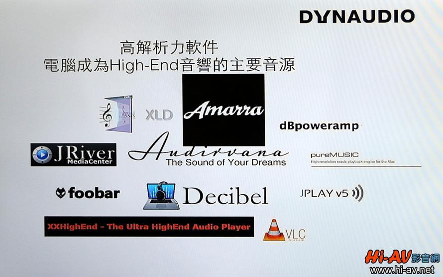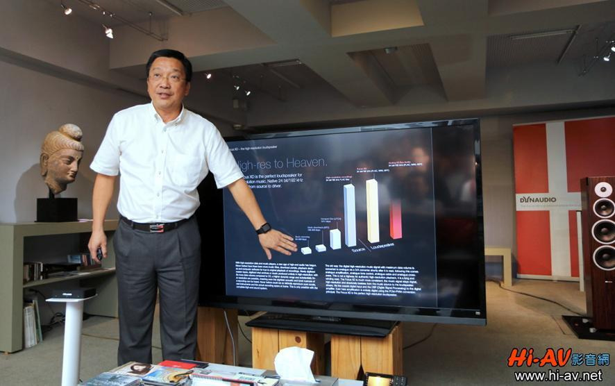 本 次發表會依舊由已經在Dynaudio服務長達22年的香港分公司營業董事周永雄先生(Tommy Chow)主講,他指著簡報上的圖表做解說,強調當前音響迷「主流訊源媒體」的音樂CD只有44.1kHz/16bit的解析度,資訊量只有數位錄音母帶 的數分之一,記錄在音樂CD光碟上的音樂信號已經割捨遺漏了極大的訊息,再加上傳統音響系統在訊源部分就轉為類比,一連串的傳輸與放大只會離原音越來越 遠;不過,現在已經有越來越多管道可取得原汁原味的高解析度數位音樂母帶檔案,只要透過Dynaudio Focus XD這樣全程數位化的音響系統,就可輕鬆擁抱前所未有的傳真音樂重播。