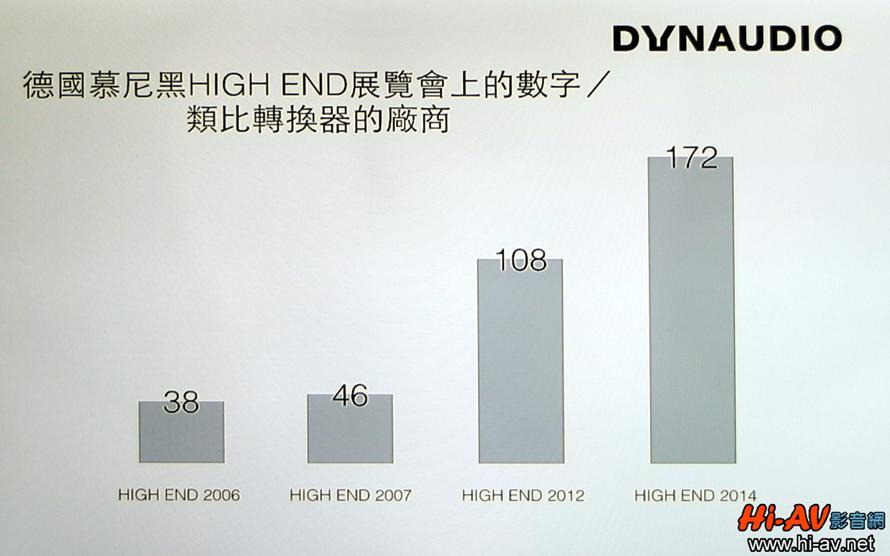 周 先生又舉了德國慕尼黑音響展參展廠商的數據作為實證,在2006年與2007年有數位類比轉換器產品者分別為38和46家,到了2012年增加為108 家,而2014年更跳躍到172家,由此可見近幾年數位流音樂播放之熱潮。既然播放的是高解析的數位音樂檔案,Dynaudio Focus XD如此全程數位化的音響系統自然就是最佳選擇。
