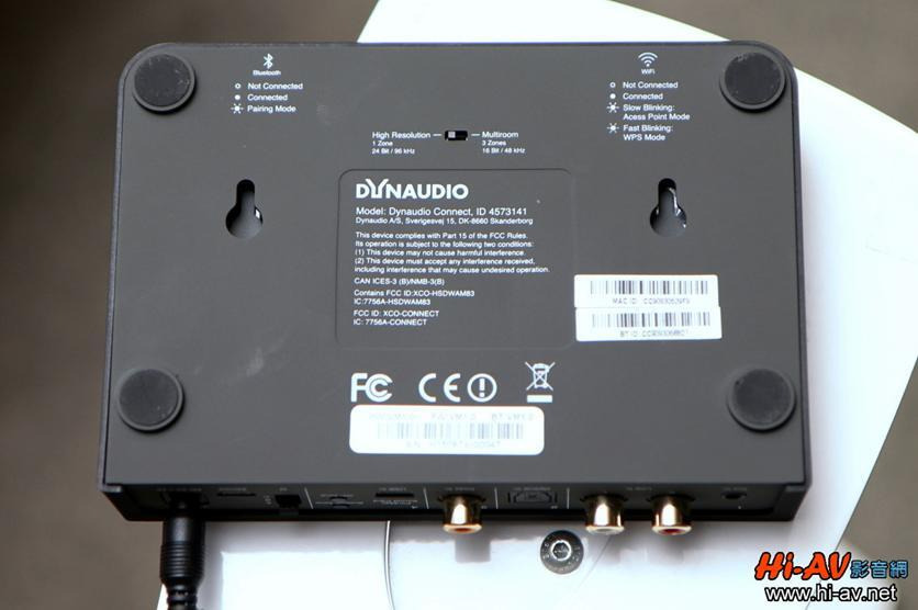 這是Dynaudio Connect的底板,看到左右各有一個壁掛孔嗎?沒錯,用家可以將它掛在牆壁上以節省空間,底板中央上方還有一個撥桿開關,可切換為High Resolution高解析或Multiroom多房間模式,前者只可對應一區但可得到24bit/96kHz解析度的無線傳輸,至於後者可將音樂信號無 線傳送到三區,但數位音樂解析度就降低到16bit/48kHz。
