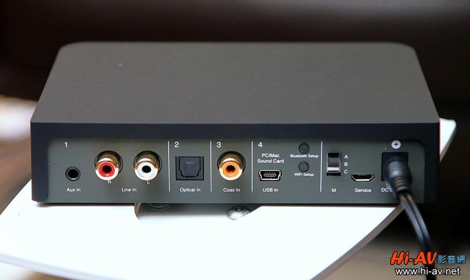 Dynaudio Connect背板的左邊三分之二與Xeo Hub是完全相同的,Dynaudio Connect少了乙太網路插孔,但多了Bluetooth Setup與WiFi Setup兩個配對按鍵,而且外接直流電源端子也不一樣,另外多了一個標註為Service的Micro USB端子,可作為日後韌體升級之用。