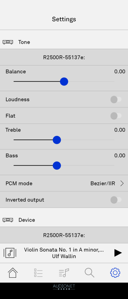 ▲背板布滿密密麻麻的各類端子,可謂可能用到的都在上面了。其中喇叭端子有分A、B,無論是驅動兩組喇叭還是Bi-Wire都可以。 APP好用 用家也不需要擔心功能眾多,操作變得相當複雜。R 2500 R是T+A最先使用官方新一代APP 「MusicNavigator G3」的產品之一。APP之所以要命名為第三代,主要是因為G3新增播放 DSD格式音樂檔的功能。筆者實際使用得說不愧是進入第三代的APP,整體設計成熟、考慮周全,可以排入筆者接觸過串流APP的前三名。 你知道嗎,T+A將會影響聲音表現的設定稱為「Tone」,而「Menu」內的設定則是跟機器運作本身相關。而在Tone選項中有左右平衡、響度平衡(loudness)、高低音量感,PCM 數位濾波。這些在APP內都標示得一清二楚,雖然在R 2500 R螢幕上有多一些些設定,但 APP內的其實就足夠了。 APP本身有幾個在筆者心中很加分的設計。第一個是專輯顯示可以手動選擇要縮圖還是列表,甚至縮圖要大要小都可以。聽起來很基本嗎?很多同類APP都做不到。第二個是會顯示每一首音樂的檔案格式、取樣率,和即時資料量(kbps)。有了即時資料量,就可以輕鬆進行DSD和PCM的跨格式比較。比如24bit/88.2kHz跟DSD64那個資料量比較多?在這APP上可以直觀看出,不需要查資料。