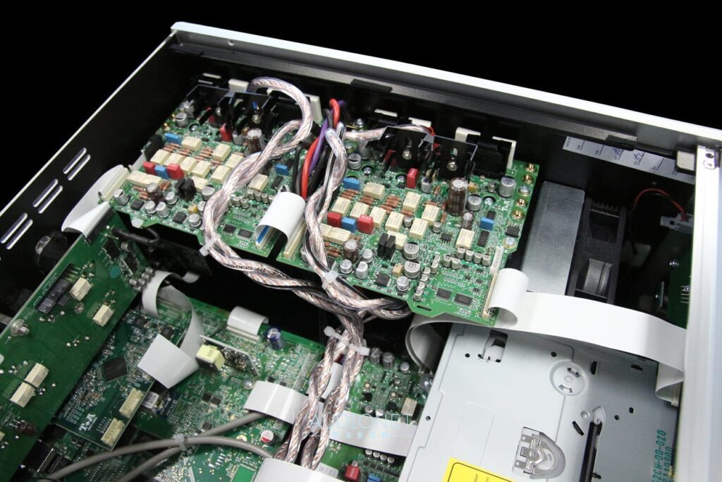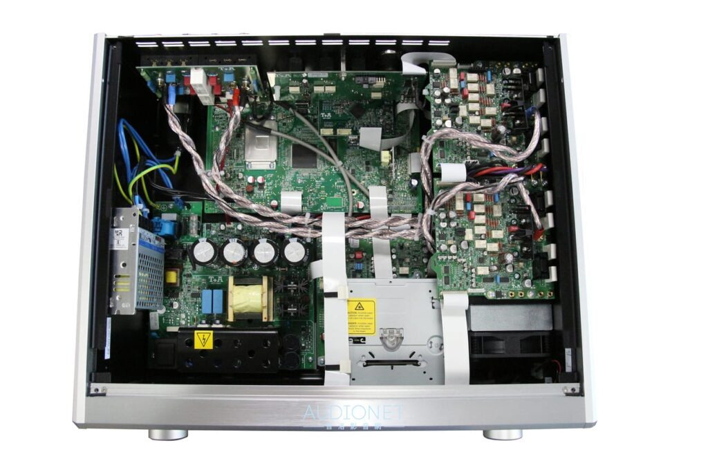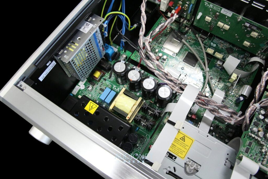 R 2500 R內部也確實有兩組交換式電源。其中自行設計,供應給類比線路的電源尺寸其實不 小,完全足以給更大功率的放大線路使用。數位處理電路板是內部佔據面積最大者,由NXP 出品的LPC2478微處理器為核心。此外還可見到用金屬徹底屏蔽的無線接收晶片。 放大電路板上可以發現大量使用Dale電阻,以及德國Eagle Cable最高階的德製系列,作為連接喇叭端子的機內線。由此可窺知T+A仔細挑選元件調音的手法。此外電路板都有架高,CD 讀取機構底下有另置抑振彈簧,甚至機箱接合處還有吸震材料補強;這些都是T+A在細節上的講究。