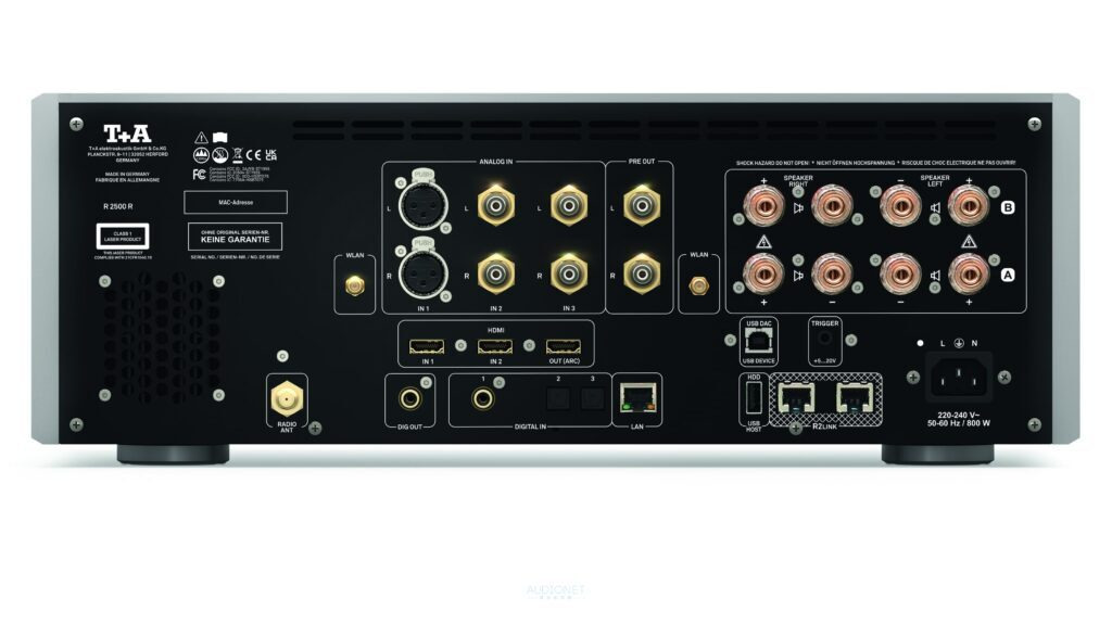 ▲R 2500 R有黑白兩色可選,正面配置是T+A傳統方式,有功率錶頭與顯示螢幕,吸入式CD槽。 超齊全端子種類 R 2500 R的焦點之一當然是超齊備的輸入方式。現在串流是最主流的輸入方式,R 2500 R除 了RJ45外,還可以使用2.4GHz/5GHz兩種Wi-Fi。如果想要更直接點,也可以用aptX HD藍牙直接從手機傳給R 2500 R。如果想聽實體唱片當然也可以,R 2500 R的吸入式CD槽還可以讀取CD-R、CD-RW、CD-text。如果想要接黑膠唱盤,也可以加價選購唱放模組(會佔據第 二組RCA輸入)。傳統的光纖、同軸當然具備,還有DAC用的USB Type B輸入,以及允許插上外接硬碟的USB Type A。甚至還有HDMI與搭配的HDMI ARC輸出,可輕鬆搭配電視、BD 播放器等顯示器材。最出乎預料的還是R 2500 R能夠聽電台。不是串流常見的網路電台(當然R 2500 R也可以聽),而是需要安裝接收天線的FM,以及2007年才出現的DAB+廣播電台。在輸出上,R 2500 R具備兩對喇叭端子,並分為A、B兩組,可以單獨開關。用家可以選擇同時推動兩組喇叭(此時阻抗不能低於8歐姆),或是作為Bi-Wire使用。此外R 2500 R還有搭載一組RCA Pre Out、一組同軸輸出、前面提過的HDMI ARC,以及置於前面板的4.4mm平 衡耳機端子。
