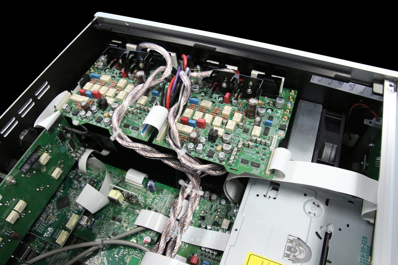 ▲R 2500 R內部電路板大致可分為電源區、數位處理區、數類轉換區、放大電路區。此外還有CD讀取機構、冷卻系統等大型元件。 招牌AB類放大 在擴大機的部分。擴大機要好,優異的電源供應必不可少。為此R 2500 R的數位、類比線路是各自使用專屬變壓器。數位部分就已經使用50瓦的交換式電源供應,而類比部分則是自行開發的高頻率正弦電供(High-Frequency Sinusoidal Power Supply)。透過正弦波週期解決傳統交換式電源高頻雜訊的問題,再利用特別設計的濾波電容群濾除最後些微的雜訊。 放大部分則是兩片完全獨立的電路板。每片電路板有完整單一聲道的前級放大、音量控制、 電壓放大與電流放大。而且沒有使用OP晶片,而是以優異元件組成的分砌式放大。這種作法可以有最短路徑,不需要整體負迴授就可以有頻寬高達150kHz的動態範圍,並且可以處理60Vss的訊號而不失真。