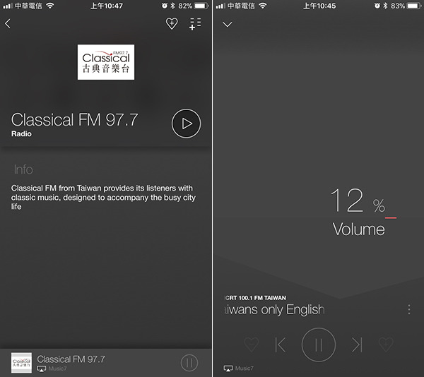 上圖為進入網路廣播電台頁面的示意圖,雖然原廠幫Music 7配了一個紅外線遙控器,但我更喜歡直接用手機控制音量。