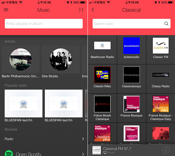 右圖是廣播電台選單示意。左圖則與TIDAL相連,如果您是會員,就可以點歌聽,下面則還有Spotify的選項。我不是上述兩者的會員,所以無法試用,但是,我若哪天也擁有了Music喇叭,肯定會加入會員。Music喇叭設定之初,App會先詢問你的音樂偏好,喜歡哪些藝人的演出,根據你的回答,App會自動幫你挑選音樂。