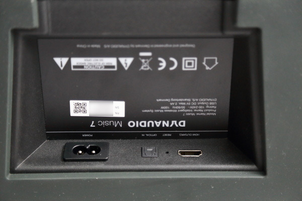 下面一個3.5mm的類比輸入,Android手機可用3.5 mm to 3.5mm的訊號線連接,而且這線原廠就附了一條,免得您再去找。Dynaudio在設計上有點偏袒Apple用家,我不在意,因為我也用iPhone。Music 7的電源插座在底部,旁邊還有兩組數位輸入,一個是光纖輸入,一個是HDMI輸入。這個HDMI輸入相當好用,它本身具有ARC聲音回傳功能,因此只要把Music 7透過HDMI連上電視,它就可以當作Soundbar使用。多數電視都有光纖的聲音輸出,用光纖不也可以嗎?當然可以,不過,光纖輸出聲音會有些微的遲延,如果有支援ARC的HDMI,當然優先使用。