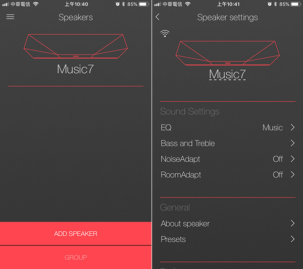 App裡也有選項,點進去後可以自己拉高低音的加減比例。除了多買一個同款式的Music喇叭,可以進行雙連配對,讓Music成為真正立體聲;還可以放在不同房間裡,進行多房間的控制。當然,這樣應用就不限於同款式了,您可以在客廳放一台Music 7,在餐廳放一台Music 3,在臥室放一台Music 5,小孩房擺一個Music 1。全家有Music,全家聽Music/ music(有點無聊的雙關語笑話,我信您看得懂)。