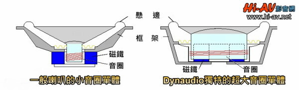 什麼是「內磁式」設計呢?看這張圖即可一目了然。Dynaudio將音圈(紅線部分)包在磁鐵 (藍色部分)外,可使音圈直徑達到一般單體的數倍之多,如此大口徑、輕量化的鋁線音圈效率更高,能產生更大的制動力,對振膜及單體運動的控制更強更精確; 此外,音圈在外圍也有助於迅速散熱,讓單體能承受更大的功率而不失真。