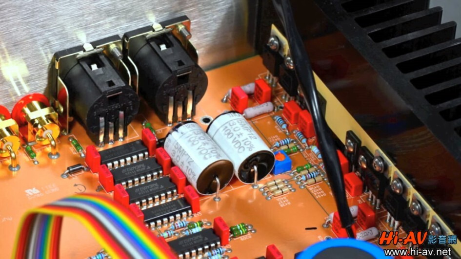 Ayre一向標榜「無負回授」與「全平衡」電路架構,這部AX-7e自然也不例外,從這個角度可以發現機箱內左右聲道完全對稱配置,這是為了得到最佳的音樂重播表現。本機整片紅銅色的電路板看起來很不一樣,原來它是一整片具有屏蔽作用的厚銅箔,真正在各元件間傳遞電流的銅箔是在電路板的中層與底面。此外,雖然AX-7e在8歐姆負載時每聲道輸出功率「只有」60瓦,但Ayre卻不惜血本地每聲道使用4對(8顆)功率晶體來執行放大工作,這顯然是為了讓每顆功率晶體的負擔降低以求減少失真與更接近真實的音樂演繹,當然代價就是成本之增加,但AX-7e只是參考售價新台幣二十萬元以下的入門款綜擴啊,這樣的手筆真是太超值了。 20160108180110