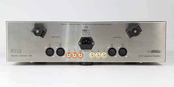 以規格上來看,AX-7e綜合擴大機沒有太多嚇人的地方,8歐姆阻抗下輸出功率60瓦,阻抗減半功率倍增為120瓦,不過頻率響應很厲害,從2Hz一路延 伸到200kHz。以AX-7e的身價來說,用不起Ayre手工打造的可變增益音量控制模組(VGT),但是Ayre訂做了專屬的FET開關與金屬薄膜電 阻音控,音量切換有66階,每1dB一階。