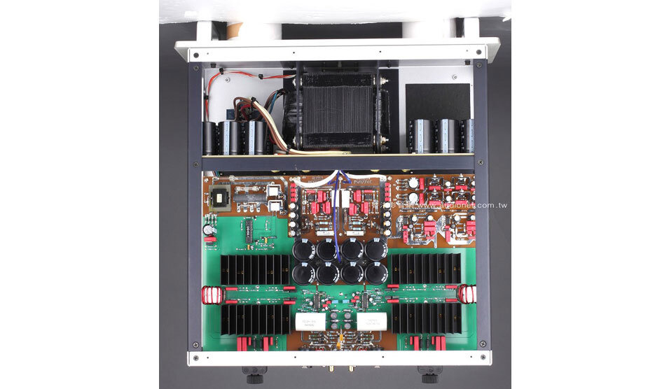 這次為何會回歸D類?原廠沒做解釋。從放大電路上來看,這次設計的主軸是美國IR公司推出的IR 2092晶片,這顆晶片的功用有三:第一, 它負責將輸入的類比訊號轉換成PWM信號。第二,它負責驅動PowerMOS晶片。第三,在PWM訊號最後經過低通電路轉換前,這只晶片會送出負迴授到晶片的輸入端。電源也是原廠特別強調的地方,DS450用的是傳統式電源供應,而且居然佔了箱體約三分之二的空間,跟其它AB類大瓦數晶體後級相比過之而無不及。仔細端詳DS450的電源,除了以一顆大型的EI變壓器供電,在整流過後,每聲道居然用上了16顆8,000μF的濾波電容,瞬間快速供給大電流的能力絕對不是問題。此外,在眼睛所及的範圍內也看見設計者共用上了9顆穩壓IC,可見電源處理分工很細。