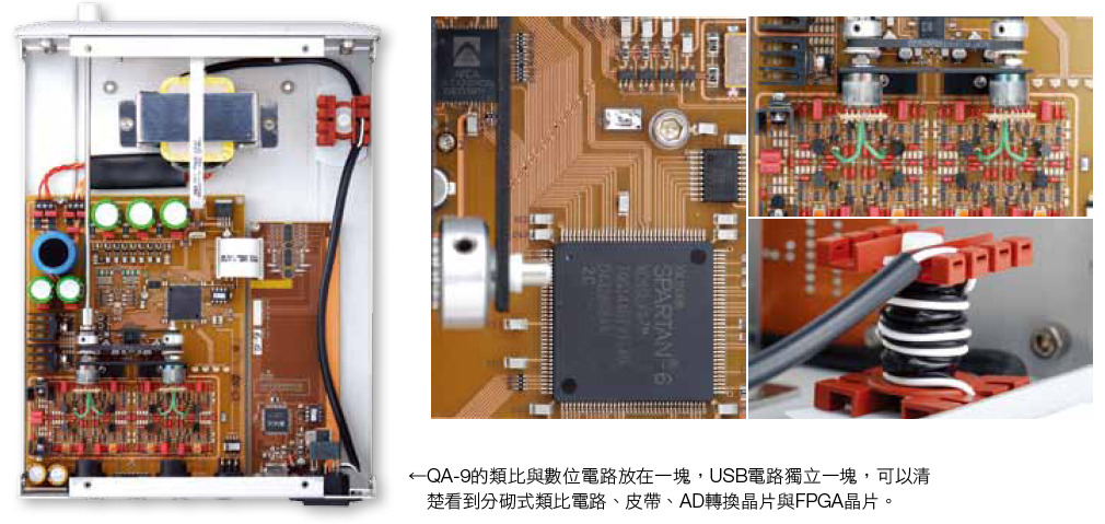 QA-9分為標準版(standard version)與專業版(Pro version),前者具有USB與AES/EBU輸出端子各一組,而後者增加DSD輸出與Word Clock的接駁功能。與QB-9相同,QA-9內部採用光學耦合器(opto-couplers),藉由電子訊號與光學訊號的轉換,讓系統與電腦端連結時處於完善的電子隔離狀態,避免RFI的雜訊干擾。另外,針對電源部份也透過Ayre Conditioner技術的線圈來降低噪訊。對Ayre來說,數位訊源的好聲關鍵一直都在類比電路,因此不論是DAC還是ADC,重點都在類比電路,所以QB-9使用電晶體與電阻分砌而成的類比輸出電路,不含一顆OP放大元件,而QA-9的類比輸入端也比照辦理,沒有絲毫妥協。