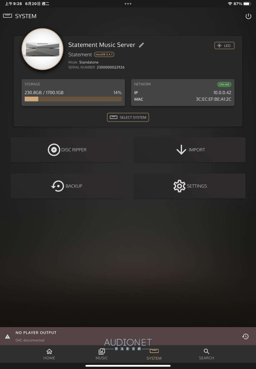 ▲從Innuos的音樂播放軟體介面可以清楚知道硬碟空間資訊以及Rip光碟的相關細項設定。