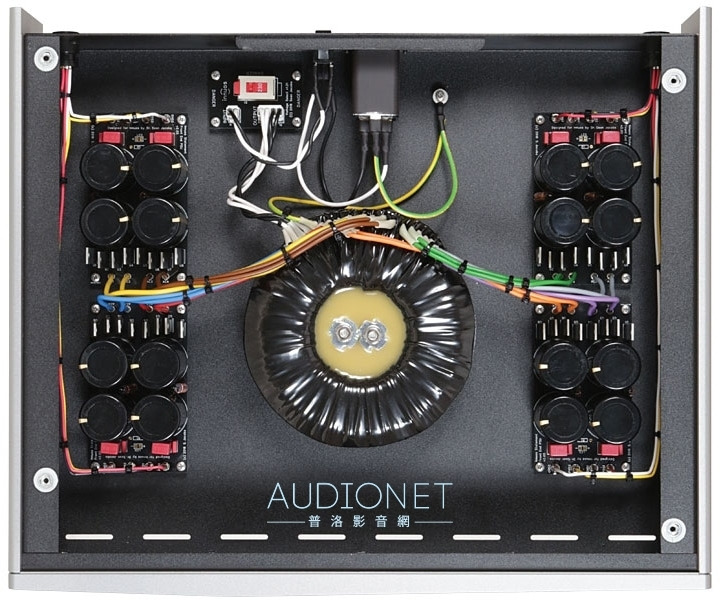 以Standard標準電源為例,Dr. Sean Jacobs在內部一共配置了一顆大型的環形變壓器,並在機身兩側個別配置了八顆德國Mundorf濾波電容(總數達16顆)。在標準電源機箱內一共具備了八組的獨立電源,分別平均分配給數位線路所需,包括一組給CPU、三組給PCB、一組給CD承盤與SSD硬碟、一組給USB、一組給USB OCXO時鐘,以及一組給RJ45端子,可說是盡可能將電源分流做到極致。 而本次試聽的Next-Gen電源升級版,除了中央配置的大型540VA環形變壓器不變,電源內最大的更動就是採用了Dr Sean Jacobs最新研發的ARC6 AC/DC電源模組,於內部增加了兩顆獨立的Choke來做主動式電源整流。而先前的Mundorf濾波電容也從過去的全數16顆,改為電容量更大的12顆Mundorf電容。雖然數量減少,但總電容量卻比過去提升幾乎4倍之多。