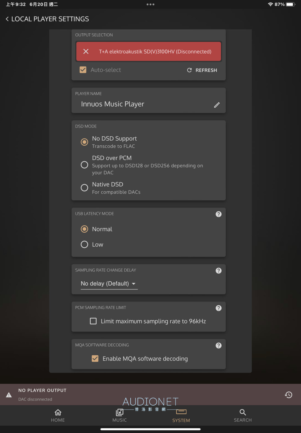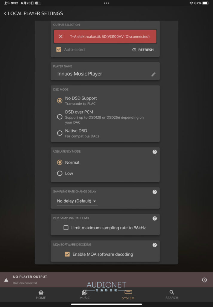 ▲原廠App裡面除了可以整合各大音樂串流平台,內中也有DSD播放的細項設定。