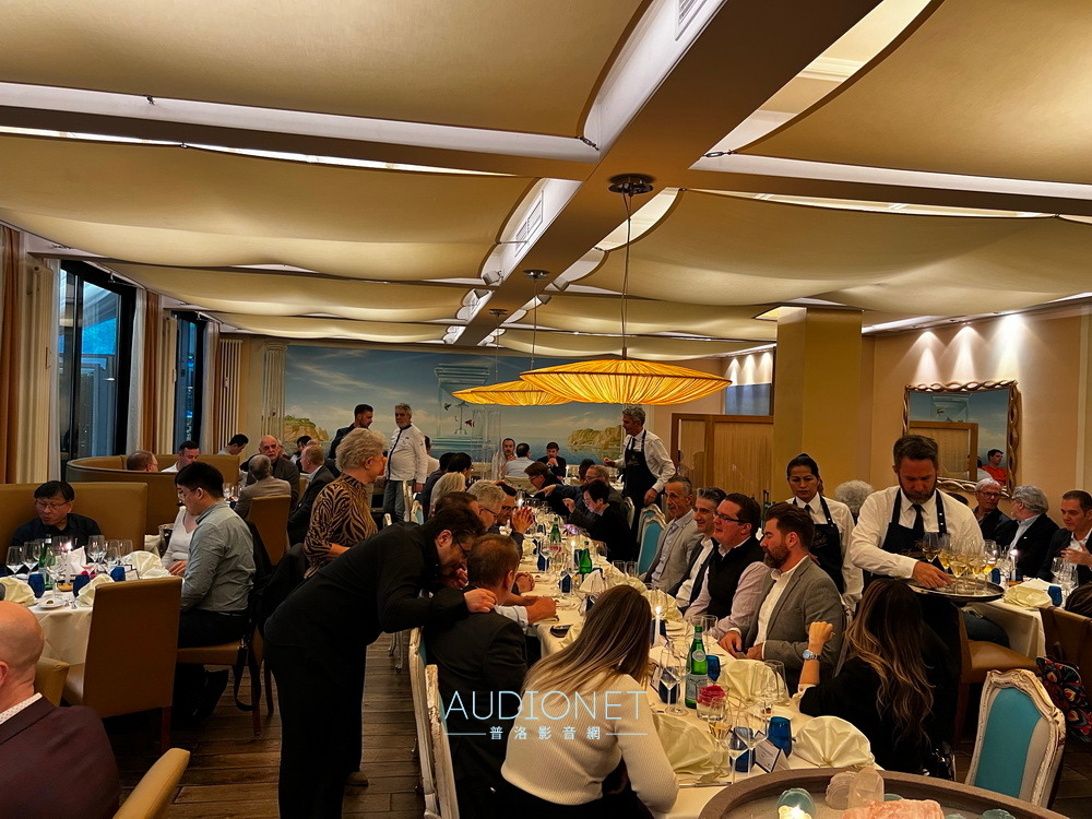 Siltech先是安排大家在會場對面的Motorworld裡面二樓的Zeppelin Lounge喝酒聊天,再分搭二部遊覽巴士,到達市內一家著名的義大利地中海料理一星餐廳Acquarello用餐,全部大約有八十幾人,可謂聲勢浩大。Acquarello是由主廚Mario Gamba (1955-)主持,每年 Siltech都在這裡宴請來看慕尼黑音響展的代理商與媒體,只是今年規模擴大了。這種與代理商、媒體緊密互動的關係,可說是Siltech成功的原因之一。