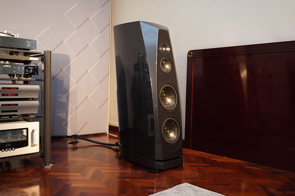 SOtM的交換器與EAhibrid的電池線性供電,是提升串流傳播品質的關鍵。 鈦孚首度在高雄展出 Rockport Cygnus 喇叭,音箱採用極為複雜的鋁合金 / MDF 複合材料,前障板內部是兩塊 3/4 英吋航太級鋁合金 CNC 車製而成,鋁合金板中間夾著黏性彈力聚合物作為阻尼,形成 1.5 英吋複合鋁合金材料,再與 3 英吋厚的 MDF 內層結合,所有單體都鎖定在鋁合金複合材料層,藉以降低噪訊並提升音樂動態和解析力。 三音路四單體設計的 Cygnus,高音單體使用鈹振膜高音,單體外圍還有鋁合金車製的導波器。中音單體則是 Rockport 最新世代的碳纖維三明治複合結構振膜。
