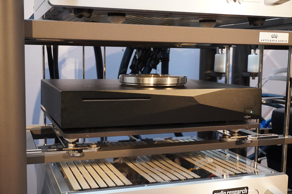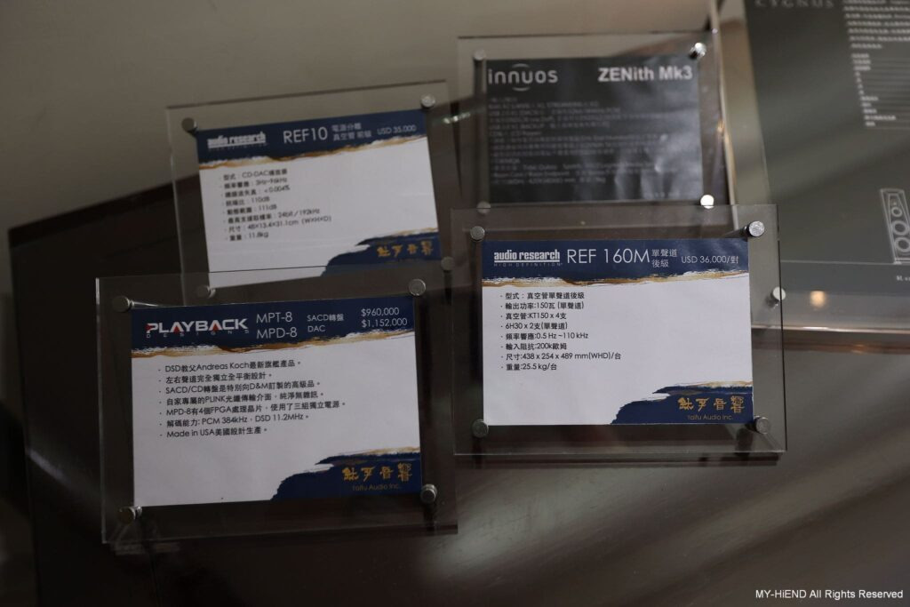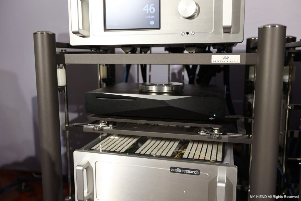 因為展房空間不大,所以佳盈沒有出動大功率晶體擴大機,而是選擇Audio Research REF160M單聲道真空管後級上陣,搭配REF10旗艦電源分離式真空管前級,果然呈現出自然又有韻味的聲音。 值得注意的是,鈦孚近日再度取得innuos代理權,innuos其實是極早投入串流領域的領導品牌,尤其是極早就與Roon密且合作,佳盈這次的Roon Core,就是安裝在音響架中黑色那部 innuos ZENith MK3串流伺服器中。