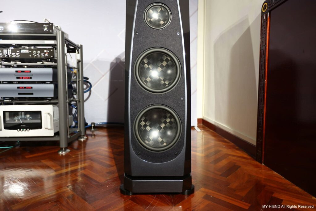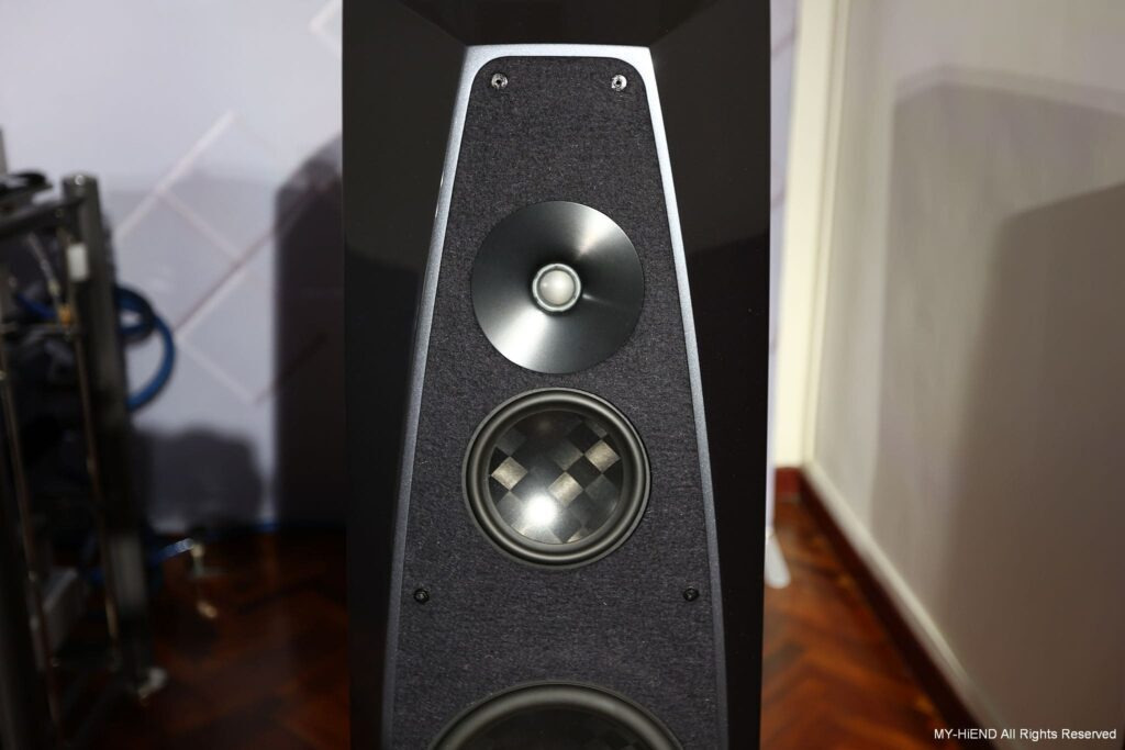 Cygnus的箱體是鋁合金+MDF複合材質構造,前障板更採用了雙層鋁合金加上中央阻尼層,藉此消除箱體共振音染。高音單體採用鈹振膜,中音與低音單體採用了獨特的菱格紋編織碳纖維振膜,原廠宣稱在硬度/重量比上,大幅超越任何最先進的碳纖維材質。值得注意的是,振膜中央與外緣區域的厚度不同,藉此打散人耳可聞頻域的共振音染,重現最細微的音樂細節、最大動態,以及最低失真。