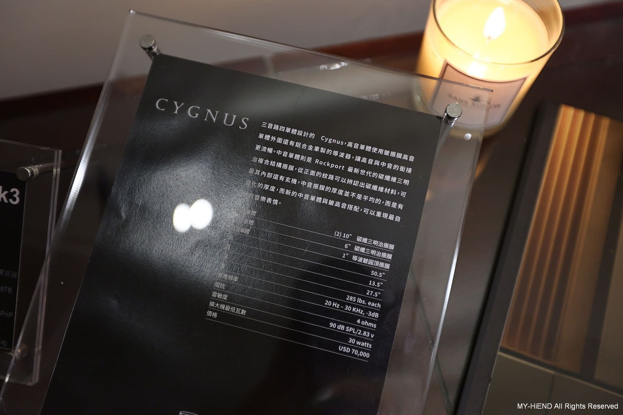 Cygnus原本是Rockport的次旗艦,在Orion推出之後,位階退居第三,不過實力仍是橫掃千軍的頂級水準。在324空間不是太大的展房中,展出重播氣勢驚人的Cygnus,這是鈦孚在台北音響展都不太敢嘗試的系統,沒想到佳盈藝高人膽大,竟然在這個空間中,調校出了非常細膩、醇美、開闊又迷人的聲音,南台灣的音響迷如果想一探Rockport的聲音魅力,敬請把握這次難得的機會。