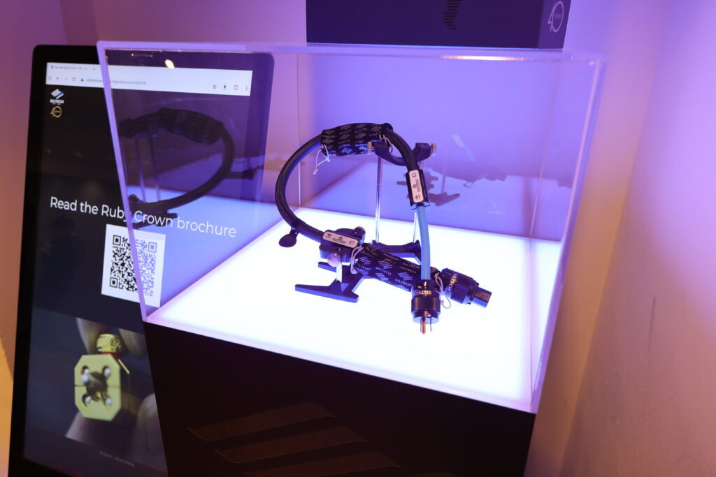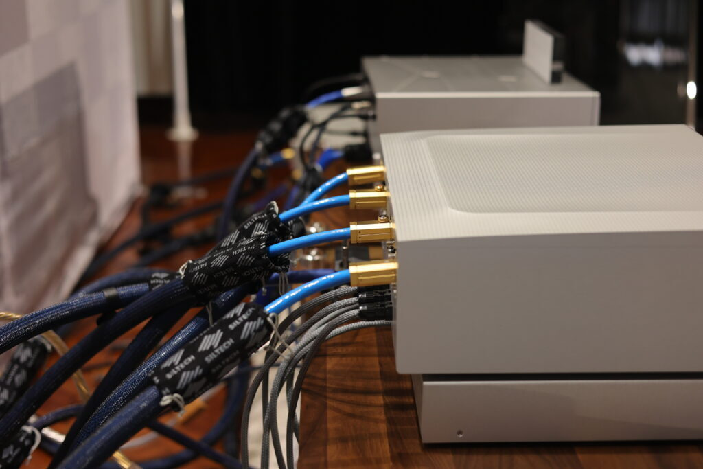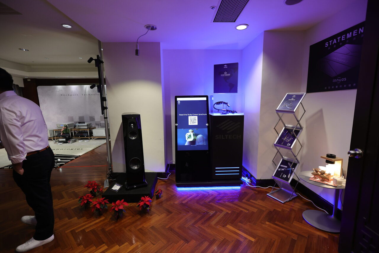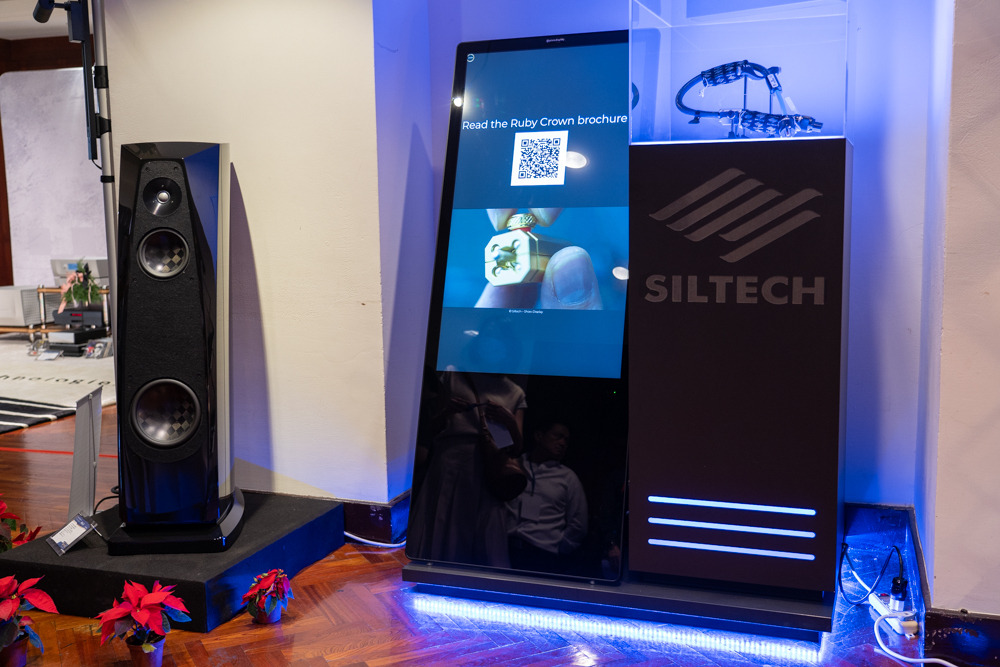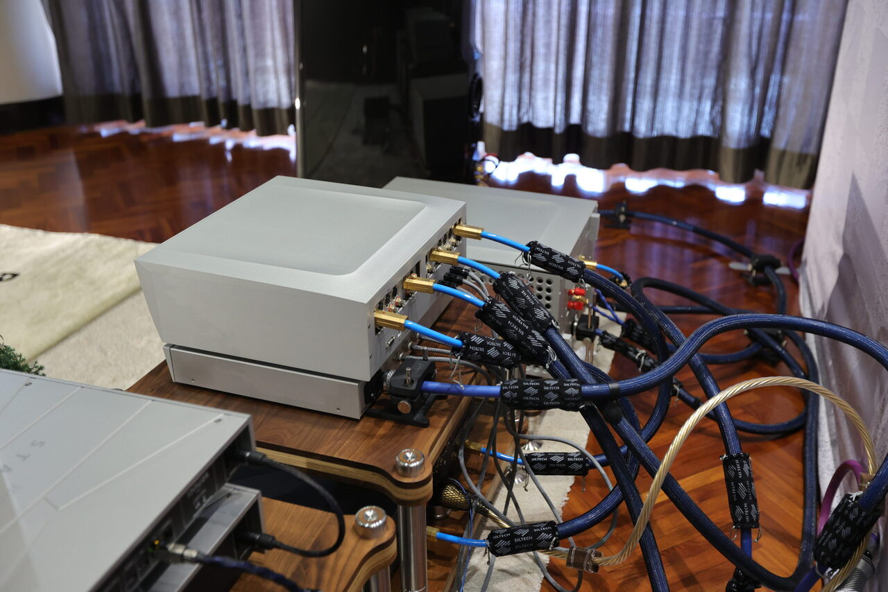 雖然 Centaur Mono II 看起來沒有長大多少,可是實際上還是變大了,重點在於加大散熱面積,讓全平衡橋接的 Centaur Mono II 擁有在 8 歐姆阻抗下具備 250 瓦輸出功率,阻抗減半增加為 500 瓦,而阻抗為 2 歐姆時提升到 800 瓦,而豐沛的驅動楞樣,來自 1,600 瓦訂做環形變壓器,賦予 Centaur II 無礙推力。音響展現場參考售價標示 320 萬。 在數位串流訊源搭配部分,使用 Innous Statement 串流播放器,是 Innuos 現階段等級最高的旗艦,採電源獨立兩件式設計,從獨立電箱送電到主機內部,區分為 8 組電源供應,包括乙太網路、OCXO 校正時鐘、USB Recolocker、SSD、主機板......等等,幾乎把可以獨立供電的部分全都拉開,避免相互干擾,而新登場的 Phoenixnet 則是網路交換器 Switch,由於考慮是音樂傳輸專用,所以捨棄 Gigabit 規格,選擇 100 Mbps,雖然頻寬較窄,但是噪訊也比較低,並捨棄網路插孔的 LED,這些都是為了避免高頻噪訊與 EMI 的干擾,同時在內部加入 EMI 吸收材料,全都是為了降低噪訊干擾失真。現場參考售價 51.5 萬。 至於線材的搭配,全部是荷蘭 Siltech,除了實地開生展示之外,鈦孚還準備了精美的展示櫃,打上美美的燈光,擺出 Siltech 最漂亮的姿態。