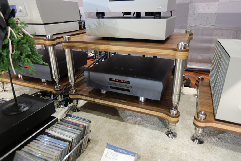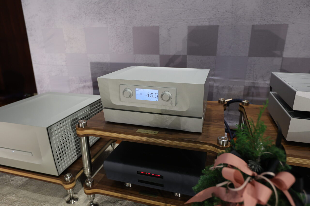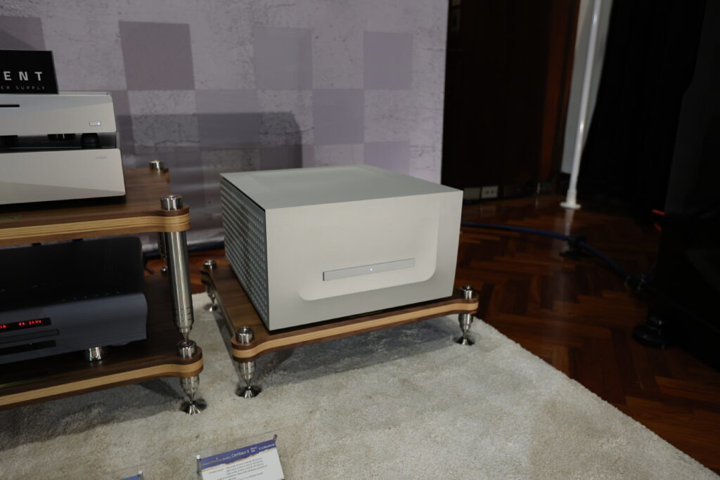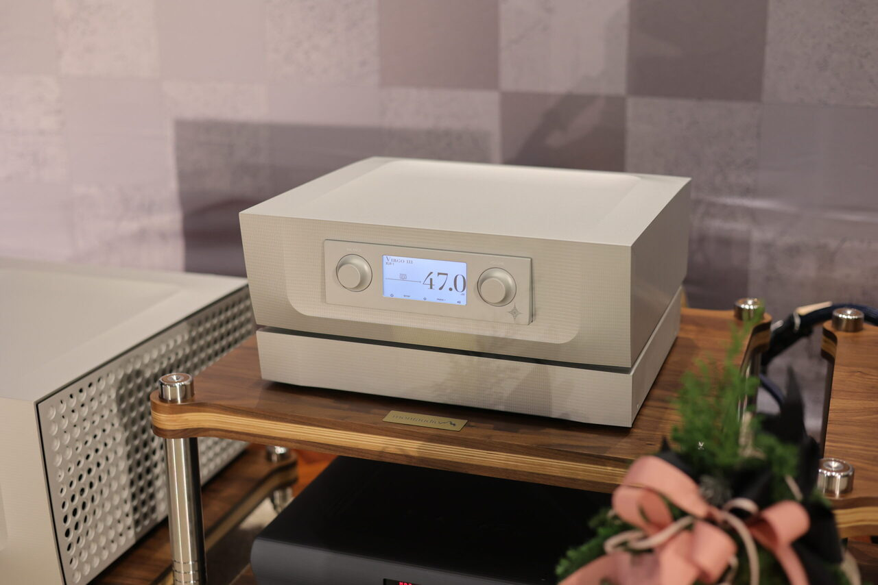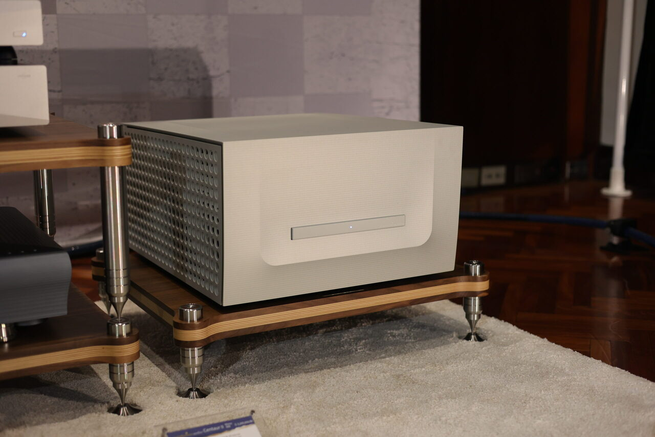 驅動 Lyra 的 Constellation,都是首度參展的新機,Virgo III 前級與 Centaur Mono II,屬於次旗艦 Performance 系列,精緻的鋁合金加工機箱搭配灰階對比得顯示幕,工業設計元素變化不大,但細部修飾得更精緻。 以 Virgo III 前級來說,更換了全新獨特的被動式數位音量控制,通電之後立刻進入最佳狀態,與前一代使用的光敏電阻比較起來,舊款需要一段時間讓光敏電阻進入適當的工作溫度,而且 Virgo III 的訊號路徑,進一步簡單化,在每一組訊號通道中,僅有兩個電阻,沒有增益,同時兼顧數位音控的準確度與類比音控的音樂性,至於線路增益模組,採全平衡放大,而且使用 Constellation 私藏(private stock)超低噪訊 FET,是 Constellation 選料的絕招,別人學不來,音響展現場標示參考售價 168 萬。 新款 Centaur Mono II 後級 同樣維持既有鋁合金機箱的設計風格,可是電源供應的濾波電容大幅增加,並將工作偏壓拉高 25%,讓 Centaur Mono II 在低功率輸出時維持純 A 工作的範圍更廣。