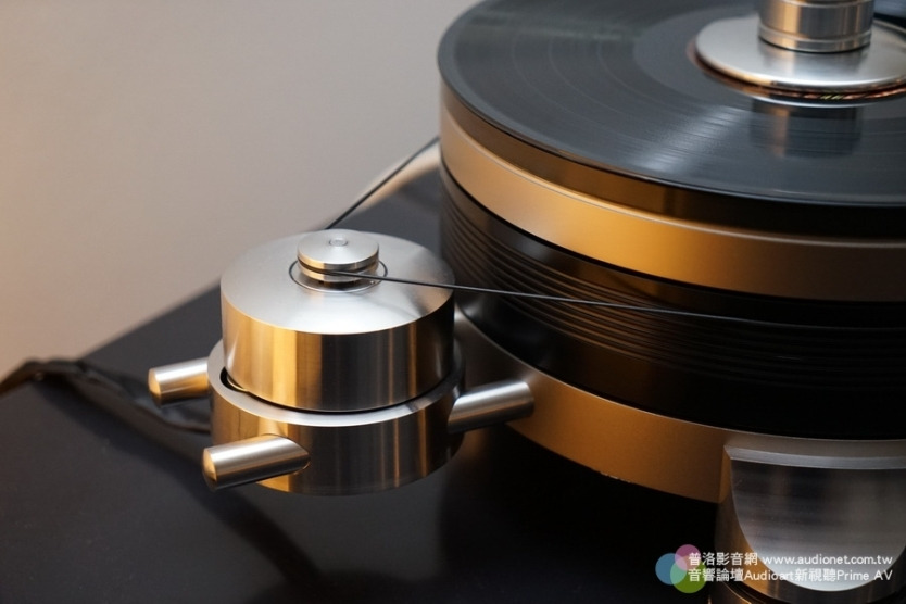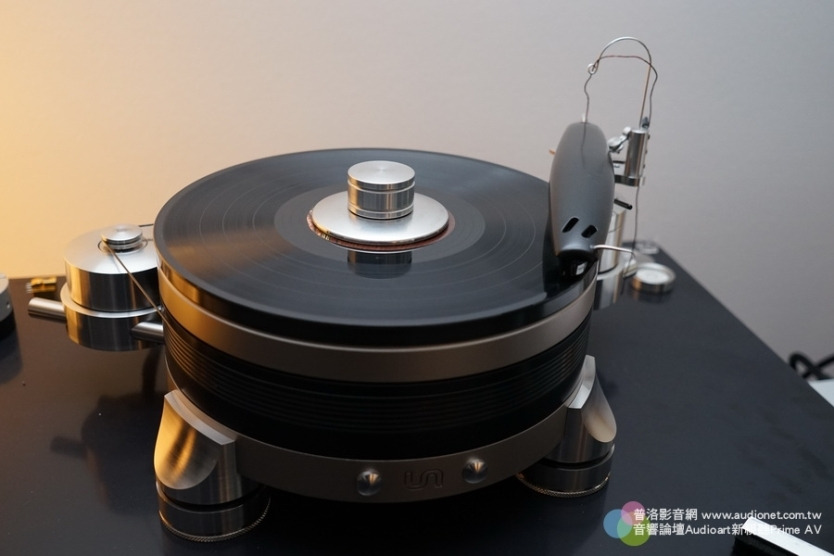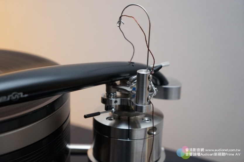 Constellation的聲音特質是溫暖柔美,而Martin Logan靜電喇叭的聲音特質則是清晰透明,這二者加在一起,聲音表現剛剛好,不偏軟也不偏硬,不偏柔也不偏剛,而且各自的味道都還能夠保留,現場聽起來相當好。   Continuum是一家製造黑膠系統 的公司,Obsidian是這部轉盤的型號,Viper則是那支怪模怪樣唱臂的名稱。不要看這支唱臂很巨大的樣子,其實質量非常輕,因為它的臂管厚度大約 跟蛋殼一樣薄。想要做到那麼薄,又要擁有高剛性,這不是一件容易的事,而且針壓調整可以微調到0.001g,這簡直就是電子針壓器的水準。軸心精度達到 0.0012mm,採用藍寶石與不銹鋼支點。而Obsidian轉盤屬於無底座設計,把振動源降到最低的可能。那個轉盤有好幾層,底下是飛輪,帶動上面的 Platter,如此可以用最小的馬達力量達到穩定轉動的效果。馬達外殼以不銹鋼製成,屬於DC馬達,裡面的電刷採用石墨製造,總之非常有學問就對了。現 場無法詳細瞭解,以後有機會再來深入探討。 DSC09453_調整大小