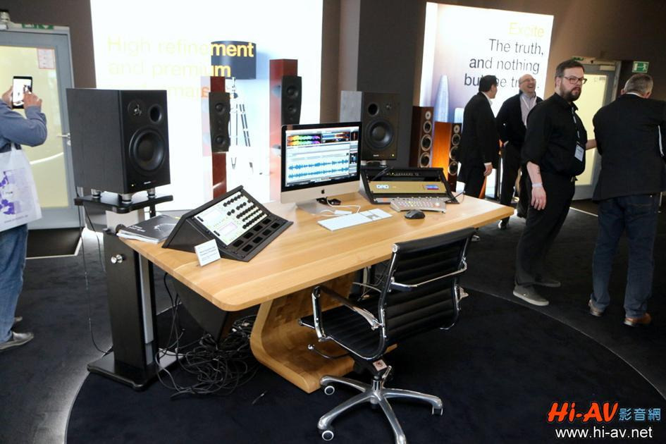 Dynaudio是極少數同時跨足專業錄音室、汽車音響與家用音響的喇叭品牌,展場就布置了一張錄音室工作桌,展示一對Dynaudio專業鑑聽喇叭來彰顯Dynaudio在專業錄音業界的影響力。展房另一側展示Dynaudio Focus XD與Xeo系列,還明白揭示數位、主動、高解析三個要素是音響系統的未來!