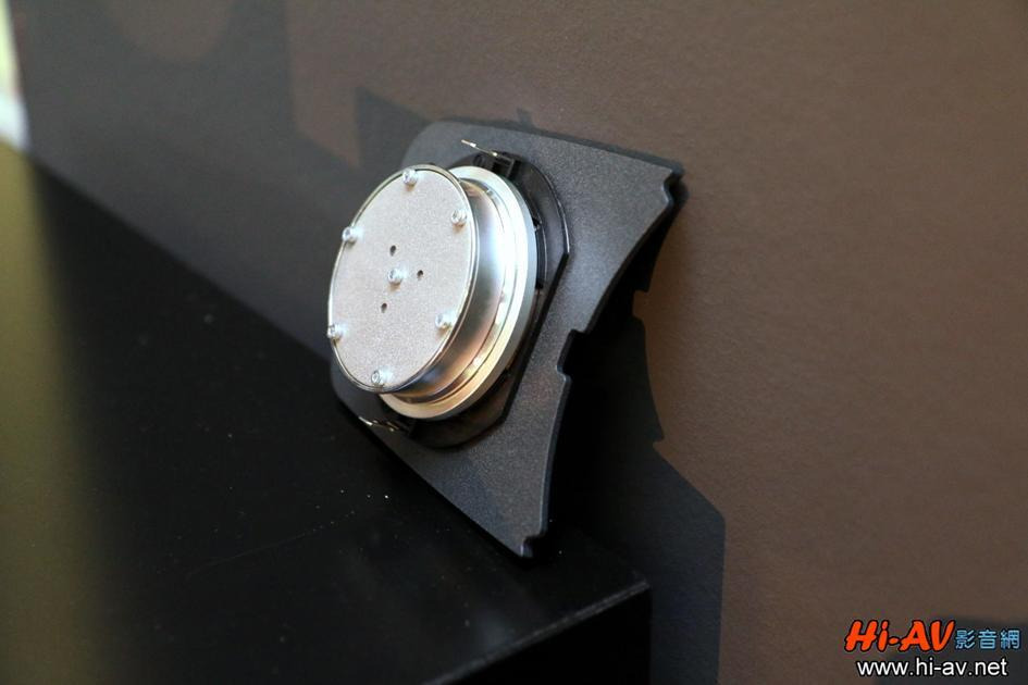 新Contour系列的單體都先鎖固在一塊厚鋁板上才與音箱結合,為的是降低音箱震動對單體發聲之負面影響(尤其是高音),請注意厚鋁板邊緣也是弧形的,與音箱毫無縫隙地密合在一起。展房旁邊有新Contour系列的厚鋁板與單體元件展示,原來這塊鎖單體的鋁板厚度不小哩,只是刻意將邊緣切削得很薄。