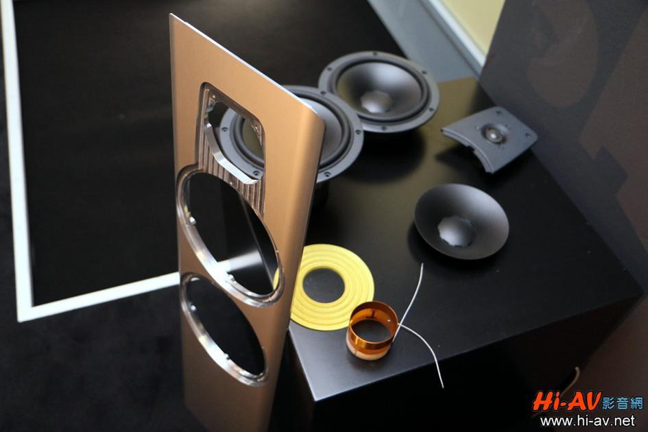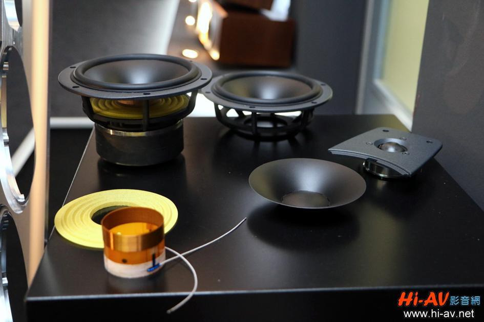 展房旁邊有新Contour系列的厚鋁板與單體元件展示,原來這塊鎖單體的鋁板厚度不小哩,只是刻意將邊緣切削得很薄。Dynaudio是極少數有完整的單體設計製作能力之喇叭廠牌,新Contour系列的單體也都完全由Dynaudio自行設計製作,看看低音單體的磁力機構多麼巨大,音圈、彈波與振膜也都是Dynaudio的獨特設計。