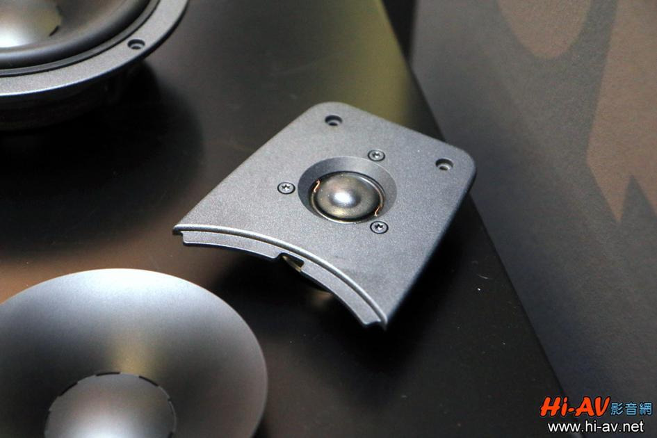 新Contour系列的高音單體先鎖在一塊小障板上,這塊小障板竟然也是整塊鋁合金經CNC電腦控制機具切削而成。這是背面的模樣,整支高音單體總成拿在手上非常沈重,加上厚重鋁合金前障板的複合式結構,可有效阻隔來自音箱及中音、低音單體之震動。