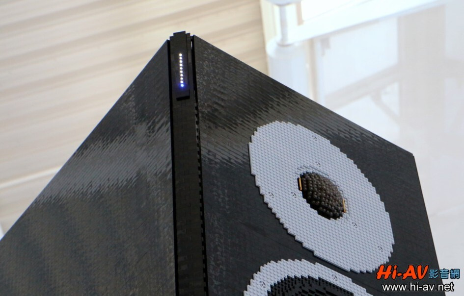 Dynaudio Focus XD系列喇叭在音箱內側頂部有一長條形狀的顯示接收窗(實品照片請點這裡),Dynaudio這個巨型樂高創作真的使用LED來顯示其工作狀態。另一方面,包括高音單體前障板的六顆螺絲、突起的半球形振膜與其左右兩側金黃色的音圈導線,也全都非常寫實地呈現了!