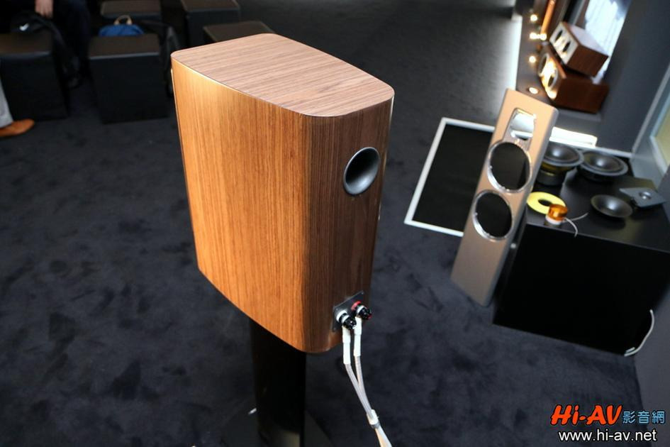 牆面右側陳列著過往的Contour系列喇叭,Dynaudio此系列從1986年就推出了,先前共有四代製品,這次新Contour系列之推出,可真是三十年來最巨大的轉變。 看看Dynaudio Contour 20書架式喇叭的背面,圓弧的曲線是否相當迷人?不使用Bi-Wire喇叭端子仍是Dynaudio一貫的堅持,新Contour系列使用WBT頂級喇叭端子。