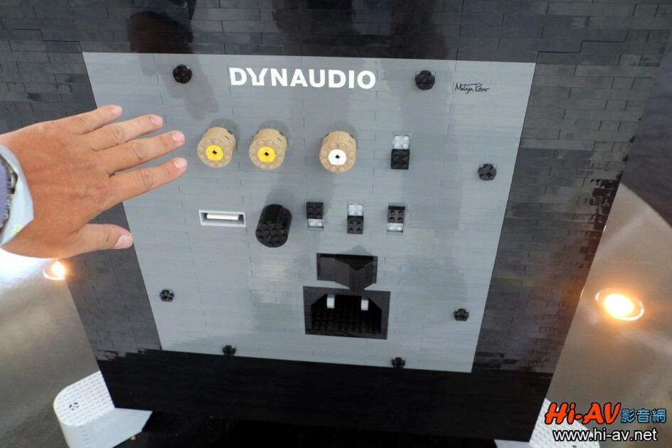 將左手掌伸出合照作比例尺,就可看出上面的信號輸入端子有多大(接線板右上角有製作者的簽名)。由於這支Dynaudio樂高喇叭實在太吸引人了,拿起相機拍攝製作細節或與其合照的參觀民眾絡繹不絕,廣告效益確實非常好。Dynaudio這款Focus 600 XD本站曾做過詳盡的介紹,想瞭解其特色與性能的朋友可點擊這裡查閱。